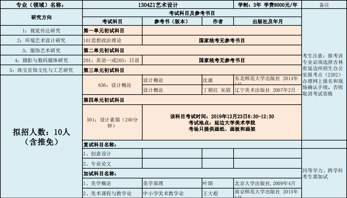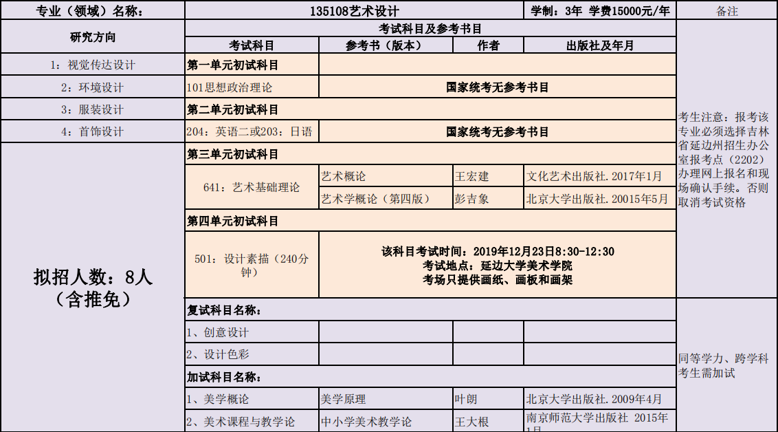 延边大学美术学院2020年度招收攻读硕士学位研究生专业目录表(学术型)