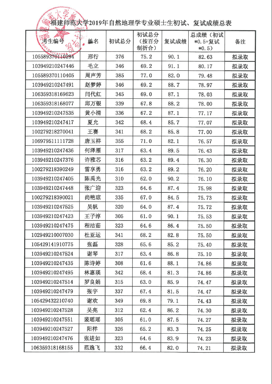 福建师范大学考研辅导班:福建师范大学2019年自然地理学专业硕士生初试、复试成绩汇总表
