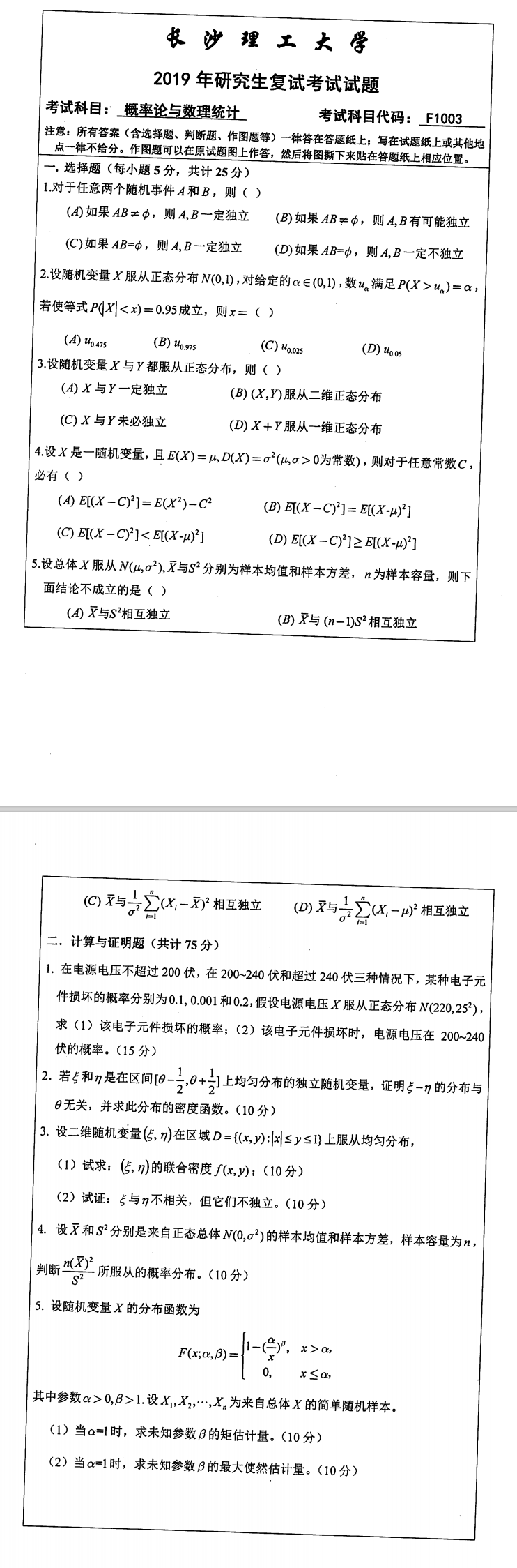 长沙理工大学考研辅导班:2019年长沙理工大学数字与统计学院考研复试F1003概率论与数理统计科目考试真题