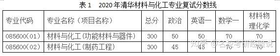 表1 2020年清华材料与化工专业复试分数线