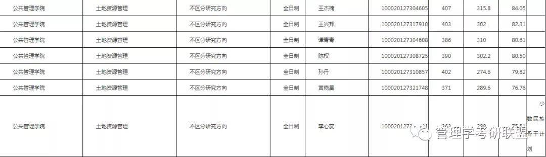 土地资源管理统考录取7人,含少干1人,最低分371,最高分407