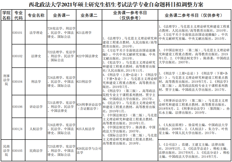 我校拟对 2021年硕士研究生招生考试法学专业考试科目进行调整,为便于各位考生提前做好复习准备,现将拟调整方案公布如下(见附件)。最终方案以《西北政法大学 2021 年硕士研究生招生简章》为准。