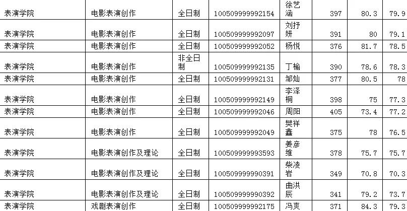 电影电影表演创作计划录取8人(拟接收推免2人),实际录取4人(外加2名推免生),录取最低分345最高分366实际参加初试的人数为72人,进入复试4人,进入复试最低分数要求:总分340,外语40,政治45,专业课一90,专业课二135,实际复试最低分345,最高分366。