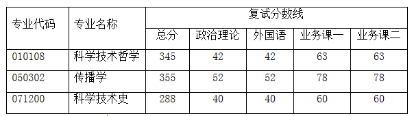 备注:报考少数民族高层次骨干人才计划、退役大学生士兵专项计划考生进入复试的初试成绩基本要求为:科学技术哲学专业总分不低于279,传播学专业总分不低于330,科学技术史总专业总分不低于268,均不计单科成绩。