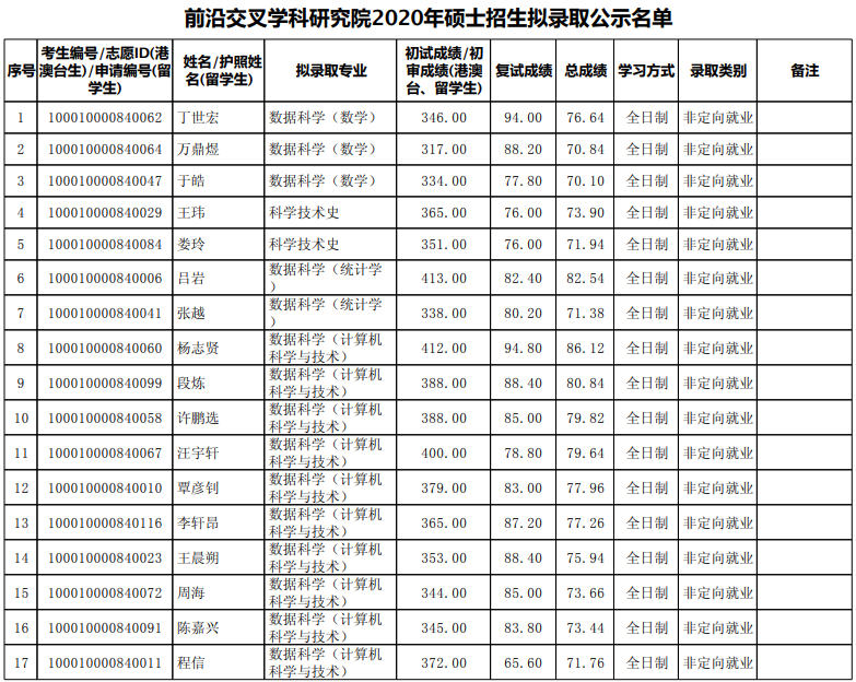 按照北京大学前沿交叉学科研究院各招生专业的招生计划和初试成绩,我院确定的复试分数线为: