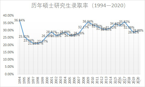 2009-2020年,考研难度不断波动,录取率基本在30%左右。