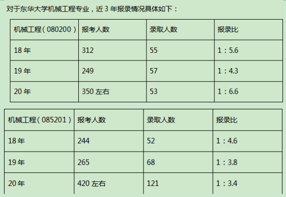 从近三年的报录情况也可以看出,东华大学机械工程(080200)专业每年录取的人数都在55人左右,而机械工程(085201)专业每年录取人数都在递增,今年由于疫情原因,扩招力度很大,录取人数也增长了许多。因此,东华大学机械工程学硕录取有一定的难度,专硕相对而言就要轻松很多。