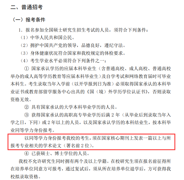 2021年北京大学研究生招生简章对同等学力报考要求,需要在国家核心期刊上发表与专业相关的学术论文,这种对同等学力报考考生的要求是比较高的。