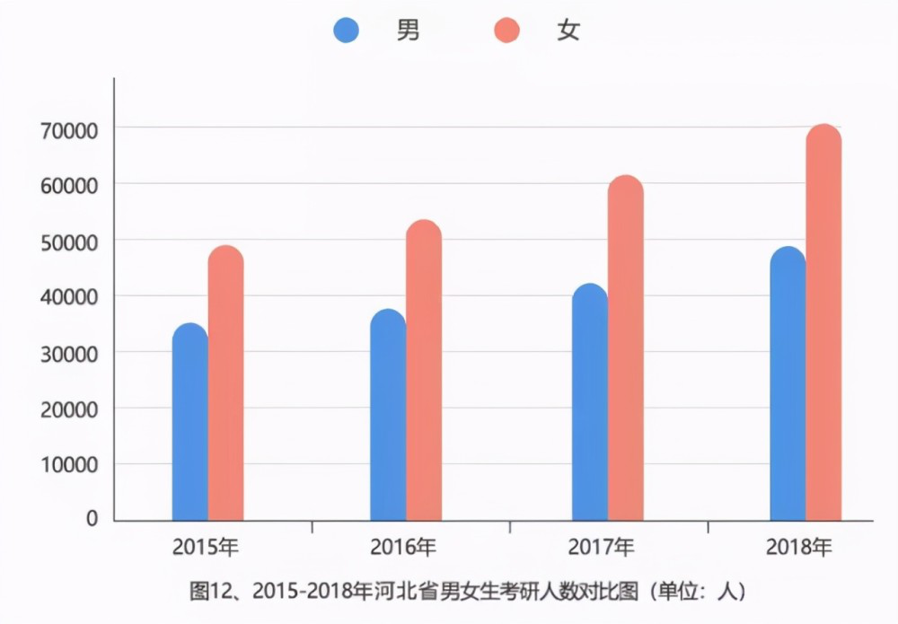 而具体到省份,这个数值则更高,河北省2018及2019年的考研人数女生占比都在60%左右,2015-2018年一直高于男生。在读的女硕士超110万,2013年到2017年,五年增长率达到45%。