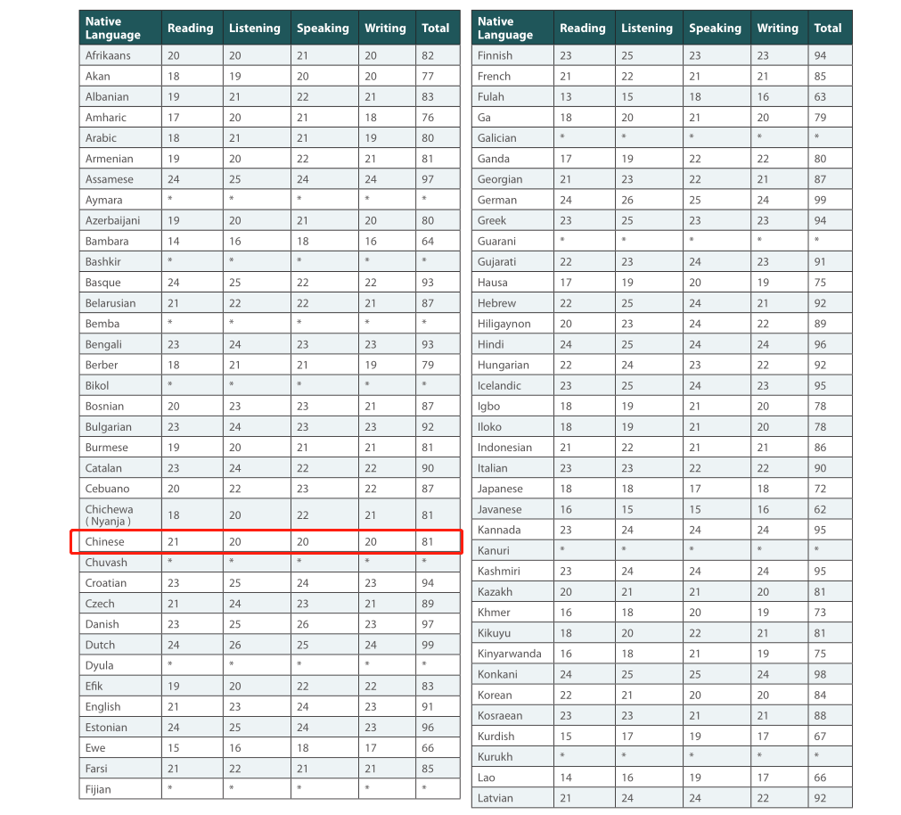 20209ETS发布的《2019年全球托福分数报告》中的数据显示,2019年中国内地托福考生的平均分再提高1分,达到81分,从图中我们可以看到,中国托福阅读21分,听力20分,口语20分,作文20分,在全球考生中的排名不容乐观,托福分数达到80分,只能超过全球38%的学生。而亚洲地区托福分数最高的三个地区分别为:新加坡:平均分98分、印度:平均分95分、巴基斯坦:平均分94分。