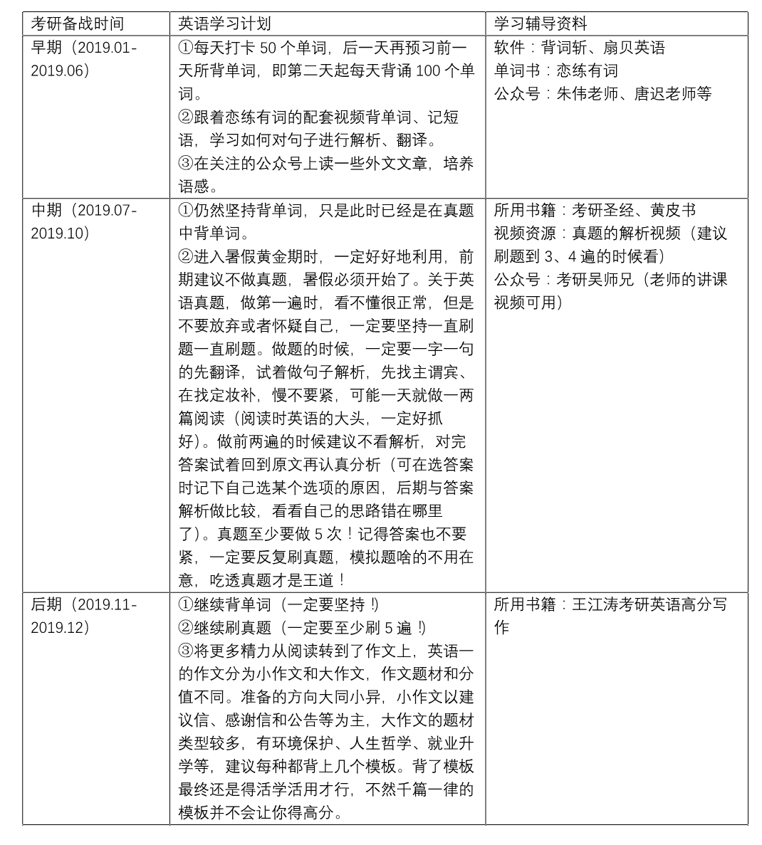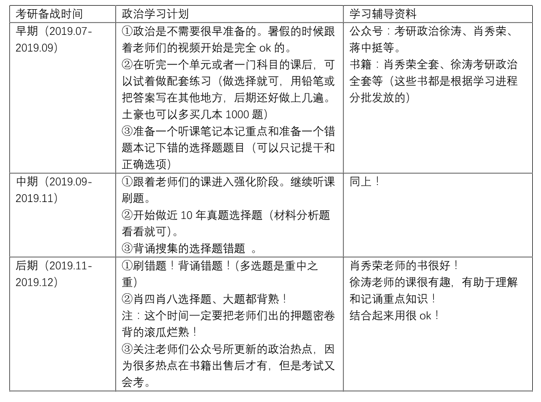 从大三开始准备考研,前期花在专业课和英语上的时间较多,后期主要是背诵政治。这样的时间安排是比较合理的。