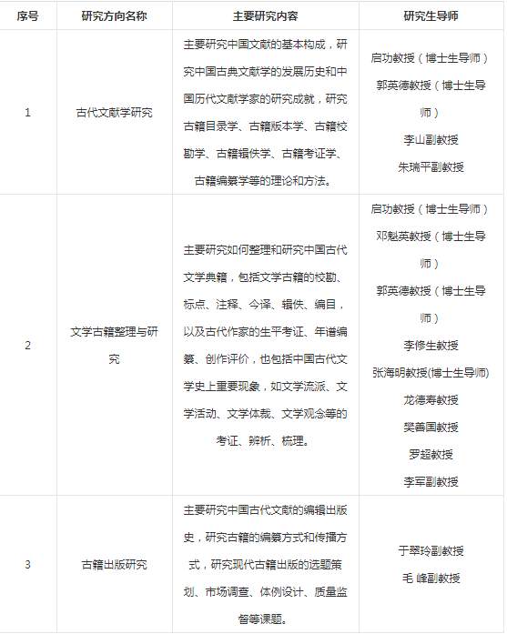 中国古典文献学专业研究方向有三个分部是先秦两汉魏晋南北朝文学文献、唐宋文学文献、元明清文学文献。中国古典文献学是探讨整理与研究中国古代文献(主要是中国古代文学文献与语言文献)的基本理论与主要方法的学科。中国古典文献学是在古籍目录学、古籍版本学、古籍校勘学、古籍注释学等传统学术的基础上,吸收了现代文献学理论和方法而形成的学科。它与古代文化各个分支的研究都有密切的关系,是支撑各类涉古学科开展学术研究的基础性学科。