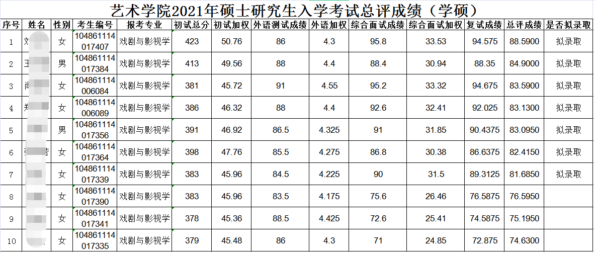 二、武汉大学艺术学院21年硕士研究生入学考试总评成绩(学硕):戏剧与影视学(学硕)