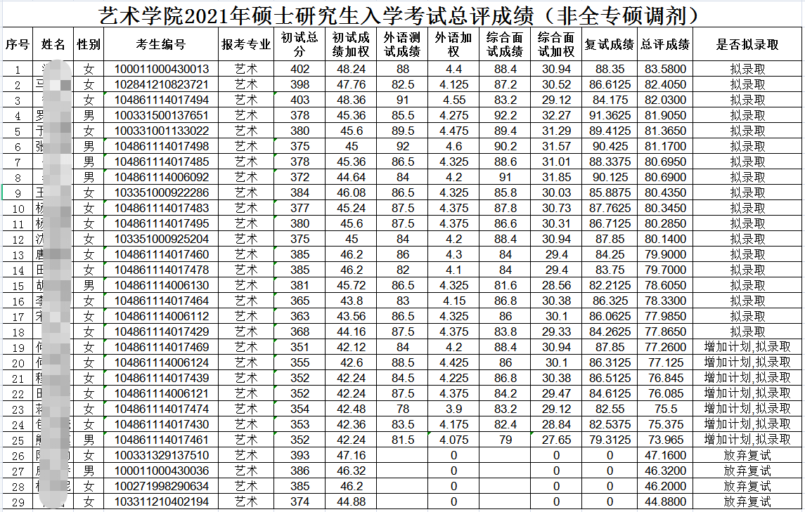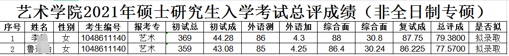 同时,通过对比武汉大学艺术专硕的最终录取名单(上面三张图),可以看到:有一些艺术专硕全日制的考生遗憾落选之后,选择了调剂进入非全日制专硕。