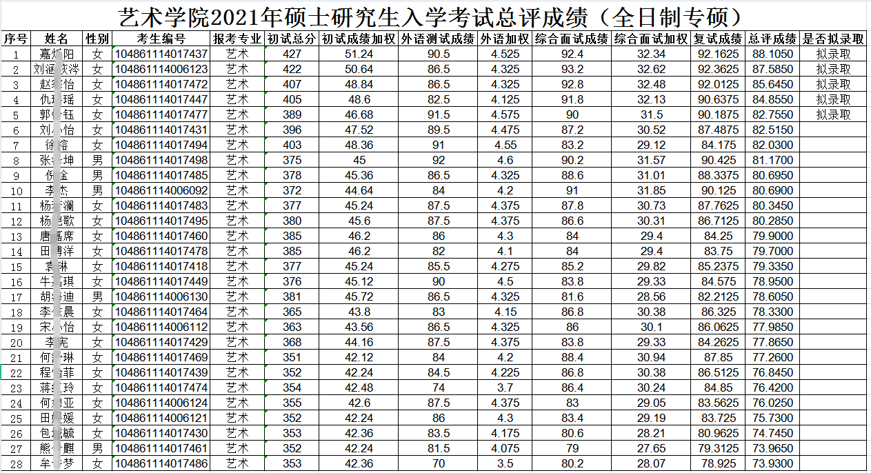 武大的艺术专硕全日制的考研竞争还是非常激烈的,有28人进入复试,但最后只有5个录取名额。