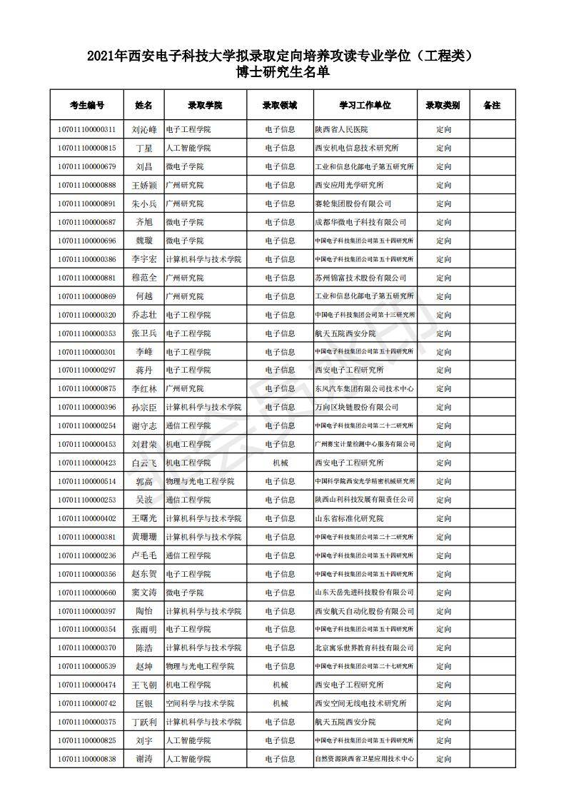 2021年西安电子科技大学拟录取定向培养攻读专业学位(工程类) 博士研究生名单