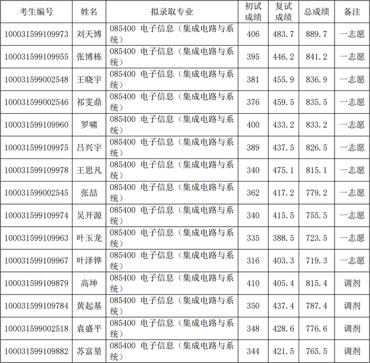 2021年清华大学深研院电子信息(集成电路与系统)硕士研究生考研复试情况及拟录取名单