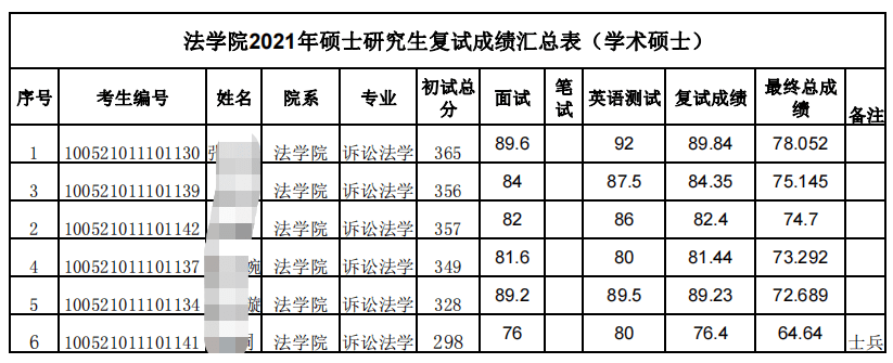 诉讼法学最后录取了6个人,其中一人为专项计划。除专项计划以外,大家的分数落在了325~365之间。