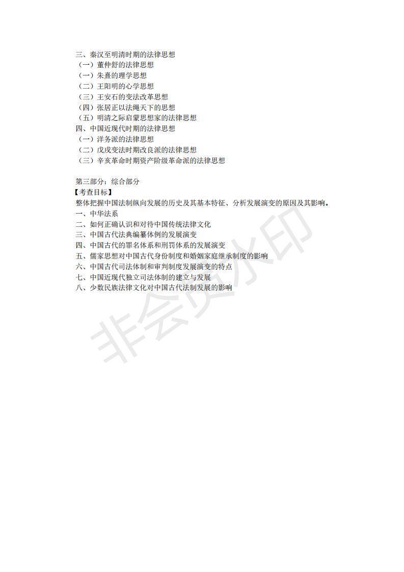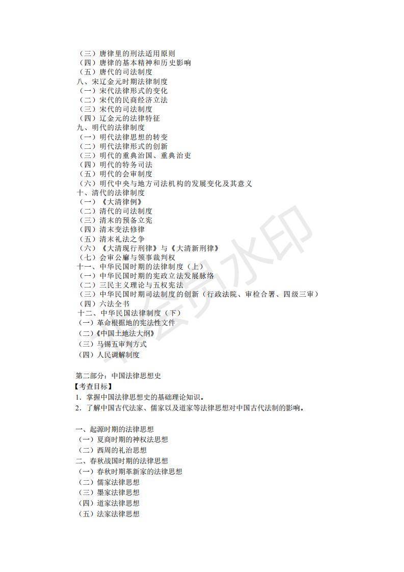 法律史由于中国法制史为法学本科生的专业必修课,中国法律思想史为法学本科生的专业选修课,所以试卷中以中国法制史考题为主,同时有部分中国法律思想史的考题。 简答题 2 小题,每小题 15 分,共 30 分 。分析论述题 1 小题, 20 分 。