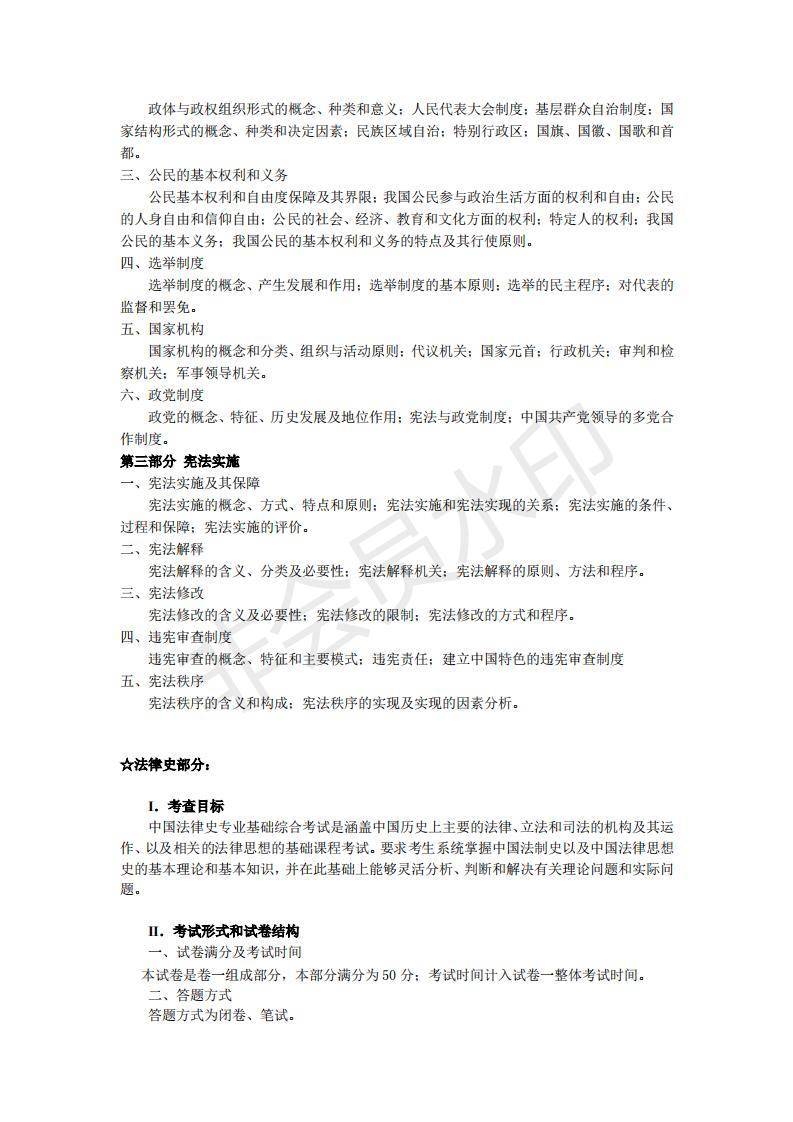 宪法学各部分内容所占分值为:第一部分宪法基本理论,约 20 分;第二部分宪法基本制度, 约 20 分;第三部分宪法实施,约 10 分。简答题,1 小题,共 10 分;论述题,1 小题,共 20 分;分析题,1 小题,共 20 分。