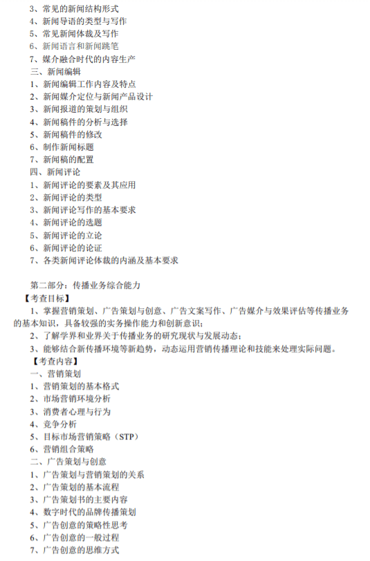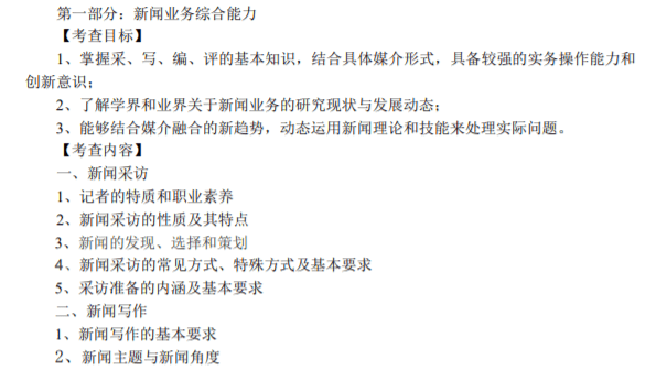 新闻与传播综合能力考试,主要考察学生对新闻业务、传播业务等基本概念、基础技能 的掌握程度和应用能力。 本科目考试内容包括新闻采访、新闻写作、新闻编辑、新闻评论、营销策划、广告策划与创意、广告文案写作、广告媒介与效果评估等课程的核心内容。从题目类型上,注重于对新闻与传播业务实践能力的测评和考核。