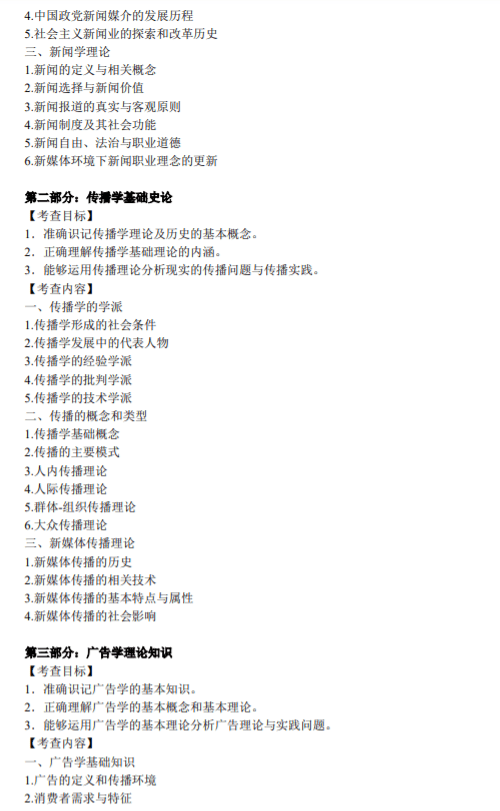 1.新闻学基础史论约为60分。 2.传播学基础史论约为70分。 2.广告学理论知识约为20分。