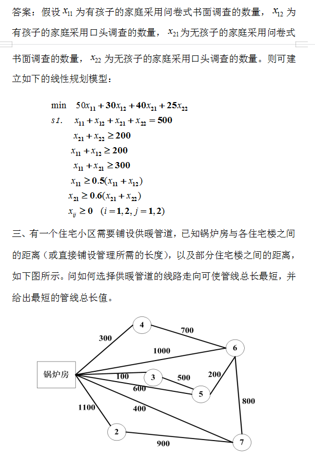 答案:使用破圈法或避圈法可得管道铺设方案:(1,4)(1,3)(3,5)(5,6)(1,7)(2,7)
