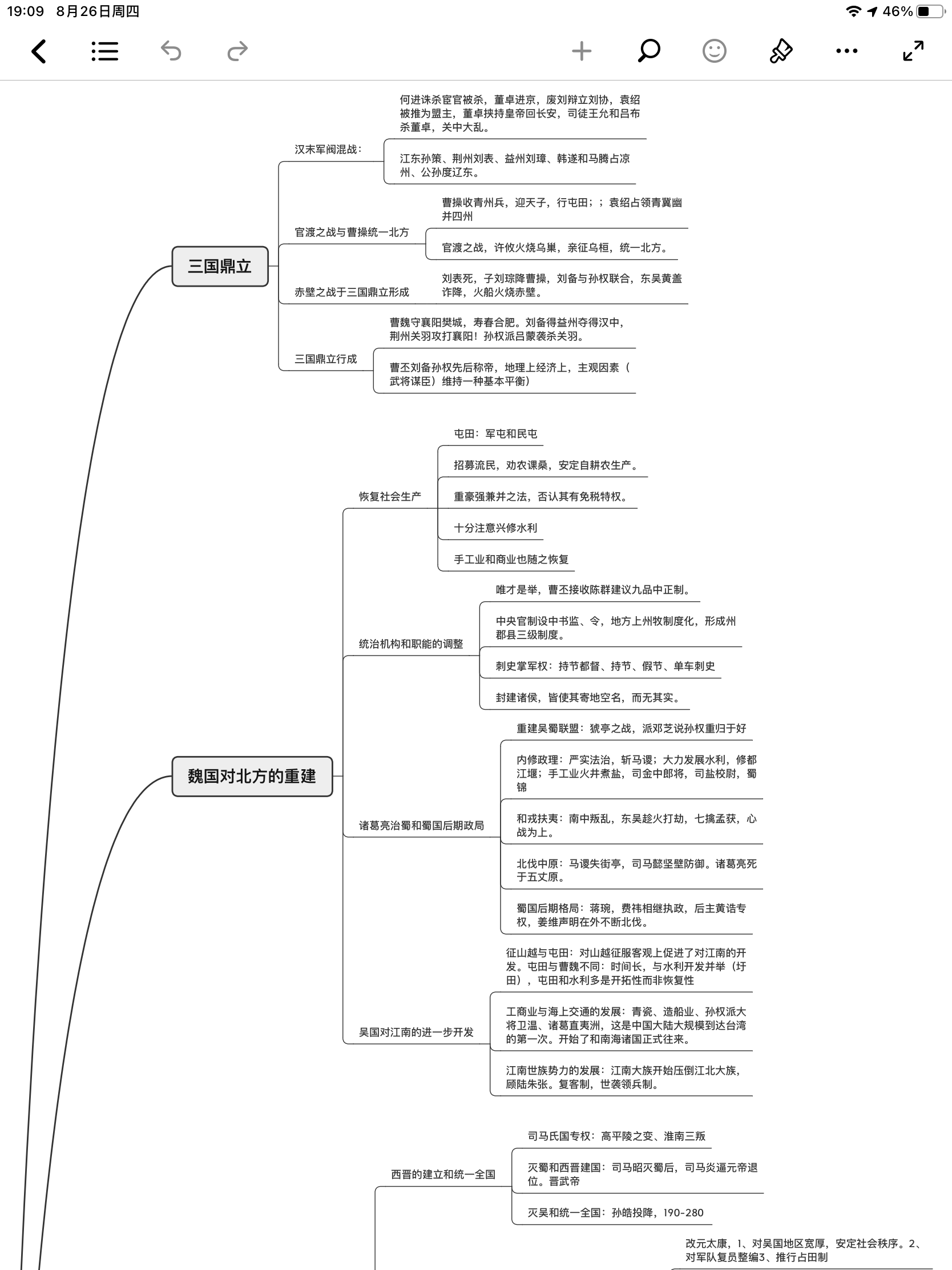 在看书的时候,我觉得要先把书读薄,再把书读厚。在初读这些教材的时候,可以买一支多色圆珠笔。在看的时候,把一些关键的名词解释,著名的人物地点都用这些笔标记出来,方便自己之后做笔记。在这里不要问我看几遍教材,多多益善,我之前就说过回归教材!.....我当时的目标是在8月份之前教材我最少要过五遍。事实是,我看了不止五遍,甚至有七遍、八遍。甚至10月份我还在看书,整理笔记。前三遍可以不做笔记只读一个大概,这是开始熟悉史实的过程。之后的4—5遍要开始整理笔记了,整理历史的横向和纵向的框架,这是把书读薄的阶段。最后的几遍,就是在框架的基础上把书读厚。把一些细枝末节的知识点加以掌握,既深化了框架,又扩大了自己的知识储备,来应付选择题。在做笔记的过程中,可以利用word和思维导图来做电子笔记,我不太喜欢用纸来做笔记,因为手写效率慢,而且纸质笔记也容易丢失和破损,电子笔记传阅和储存方便高效。下面是我做的笔记: