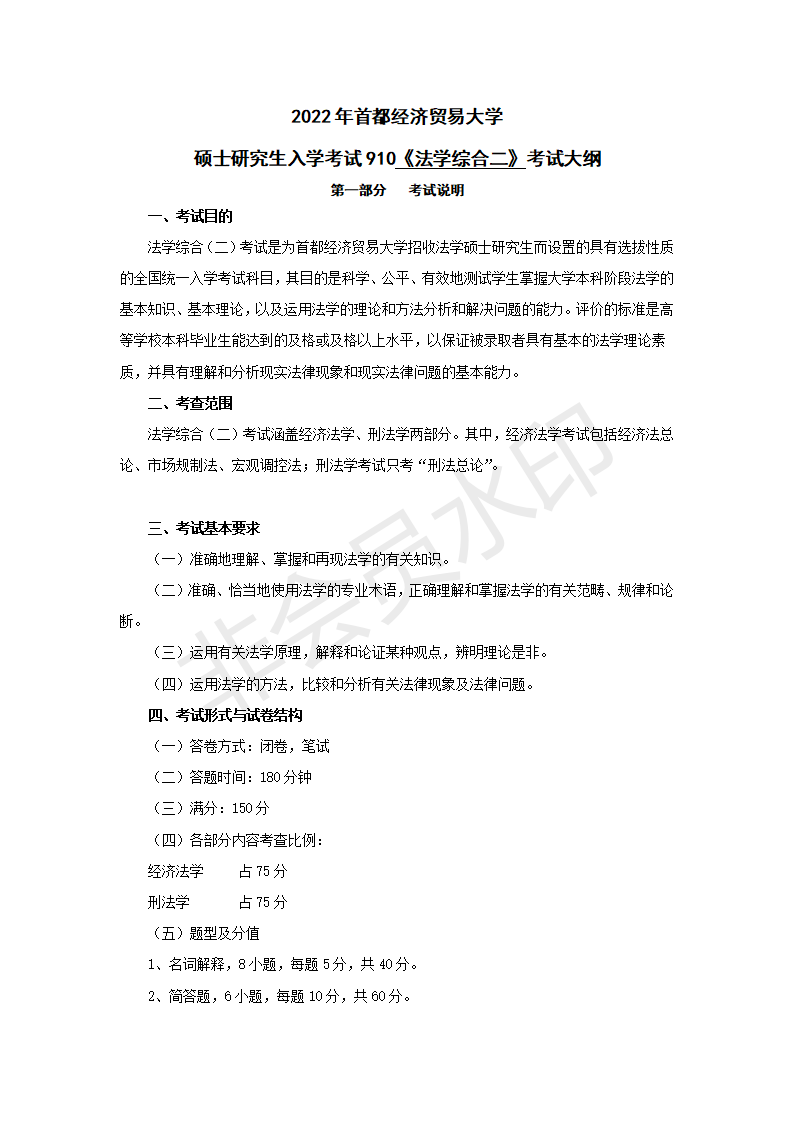 22年首都经济贸易大学考研910《法学综合二》考试大纲
