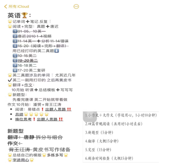 如图是我考研英语的规划和学习到的对考试时间的分配。2月份开始记单词;到5月份,看了2010年真题唐迟老师阅读解析思路后开始刷英语一的历年真题,主要刷阅读,偶尔会带着完型和翻译(新题型考得不一样所以没刷);到9月份开学基本刷完了,期间听别人建议做过精翻,的确有效果,但之后没耐心就没翻了,有耐心的想提升英语能力的朋友可以一试,感觉对阅读、翻译、写作方方面面都有用处。之后10月份那段时间有点混乱,既在看之前刷的英语一的错题,又在刷英语二,同时还看了翻译和作文。建议听几篇唐静英语一的视频学学思路(看了才知道自己语言组织能力有多差)作文的话,在前期(10、11月)我是选择了王江涛老师的《高分作文》中的一套(10篇)反反复复背,这个阶段我是当作语句素材的积累。大概11月中旬开始,我隔些天会来一次全套模拟。(说到这儿大家一刷二刷英语的时候一定要留几套全新没做过真题来模拟这样效果更好分数也更真实最好留比较近的几年出题方向更靠近)模拟完了我会当场对答案。对于阅读、新题型和完型,我是错得少就直接看解析理解,错得多就第二天重新思考之后再看解析;对于翻译,我会看一下唐静的讲解,看他是如何措辞的;对于作文,我留的几套模拟中我只写了两套的作文,我写完一般会拍照录入到有道里面,它有考研作文的功能,帮你以英语一的标准为你的作文打分,同时还会给你指出错误并推荐可替代的词组等。除了全真模拟,我在后期就是继续背作文和整理作文模板了。