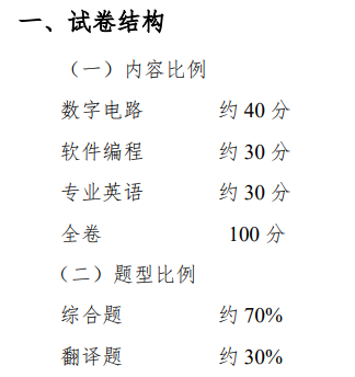地大的复试是比较晚的,分为笔试和面试两部分,分数占比为1:1。笔试考的是C语言跟数电还有专业英语。试卷结构如下,考纲官网和招生简章一起发布,每年变化也不大(https://jidian.cug.edu.cn/info/1097/2072.htm)