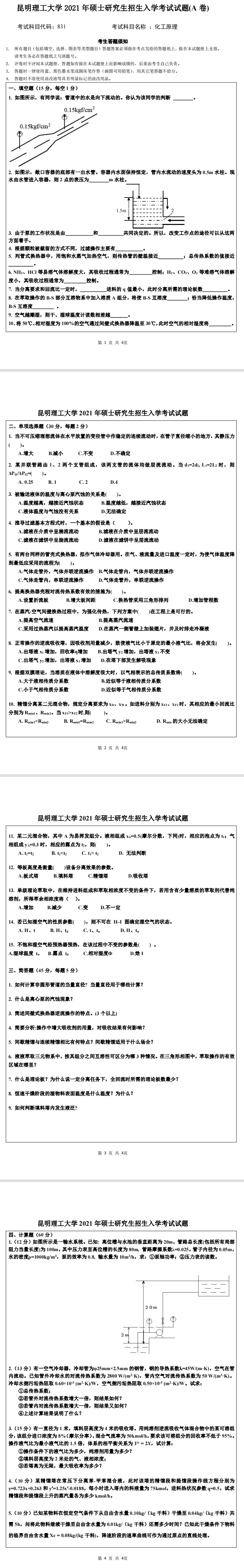 昆明理工大学考研辅导班:2021年昆明理工大学化工学院考研831化工原理考试真题
