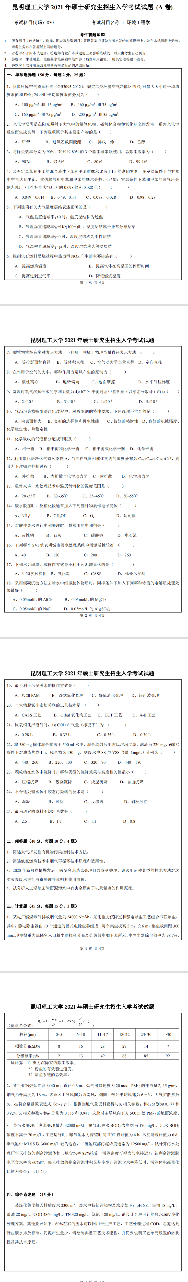 昆明理工大学考研辅导班:2021年昆明理工大学环境工程学硕830环境工程学考试真题