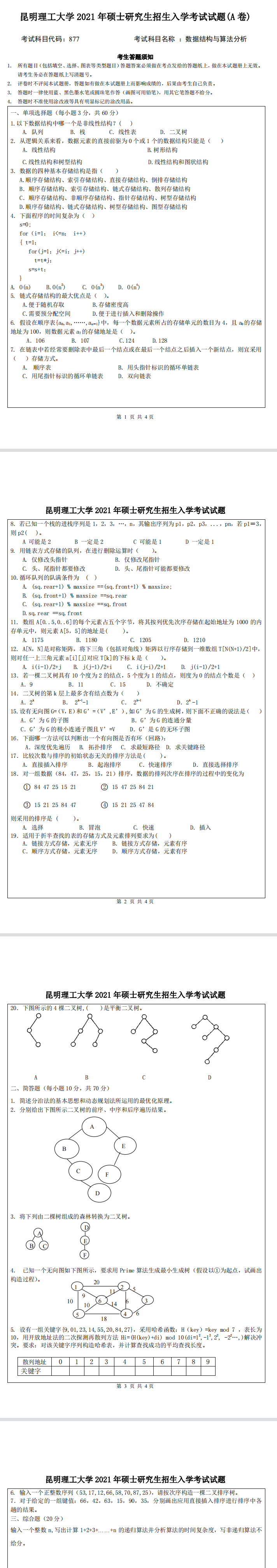 昆明理工大学考研辅导班:2021年昆明理工大学计算机专业考研877数据结构与算法分析考试真题