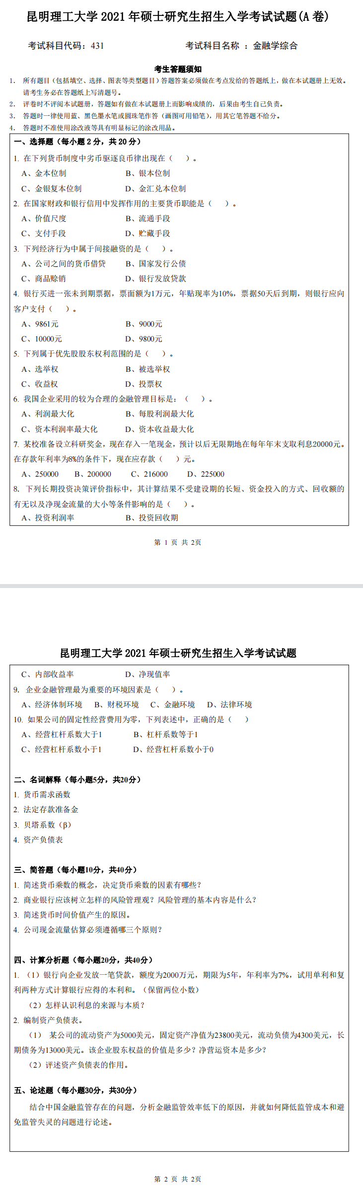 昆明理工大学考研辅导班:2021年昆明理工大学金融专硕考研431金融学综合卷考试真题