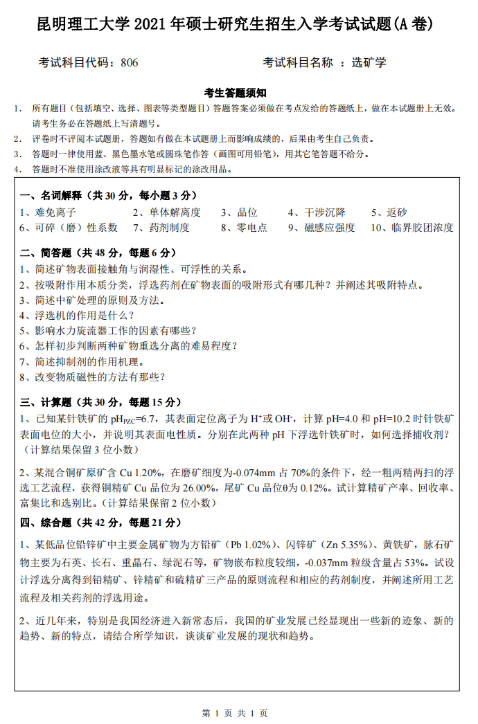 昆明理工大学考研辅导班:2021年昆明理工大学矿物加工工程专业考研806选矿学试题