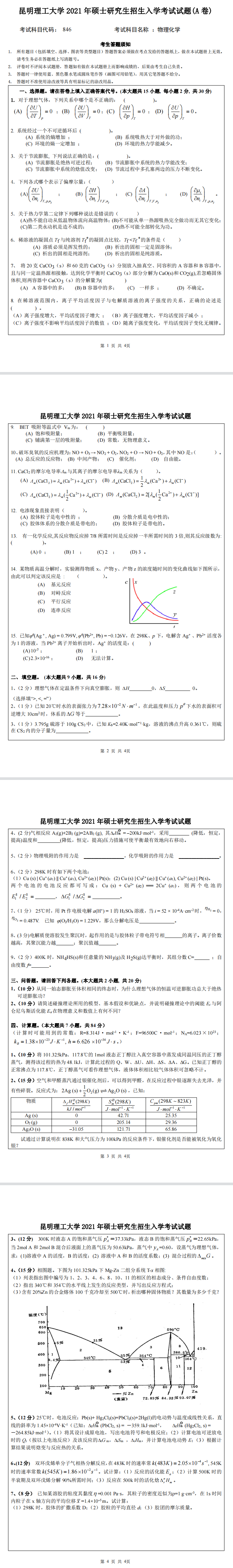 昆明理工大学考研辅导班:2021年昆明理工大学研究生入学考试846物理化学考研真题