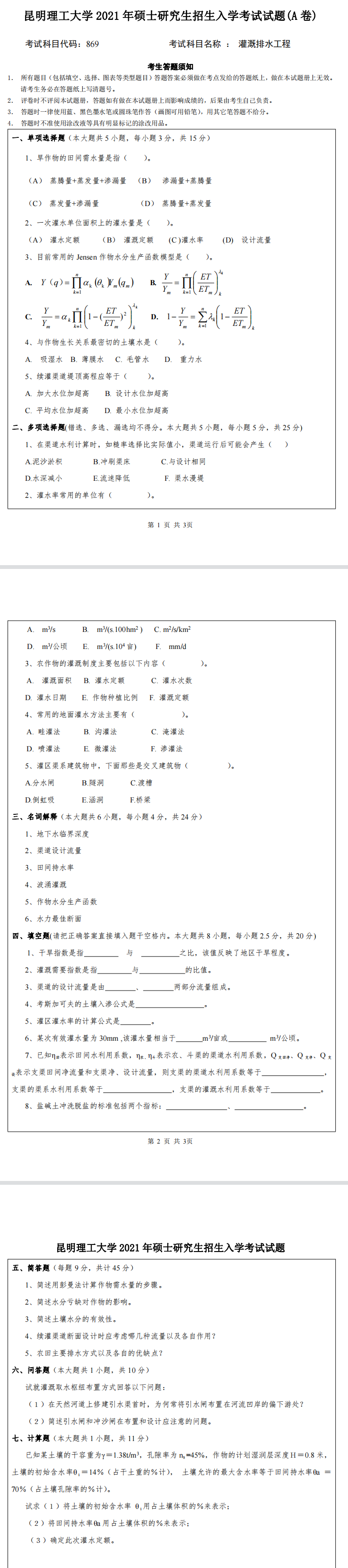 昆明理工大学考研辅导班:2021年昆明理工大学研究生入学考试869灌溉排水工程考研真题-新祥旭
