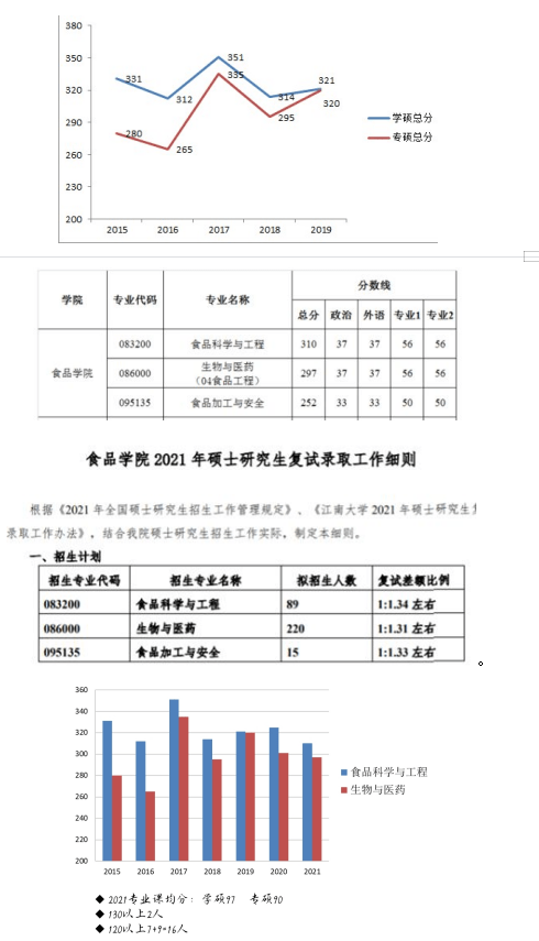 江大招生及报录比,2021年复试分数线,专业课的分情况,我整理成了图表形式,详情见下图分别为①2015年以来学硕专硕分数线汇总②2021年复试录取分数③2021年招生人数及报录比情况④2021年专业课得分情况。