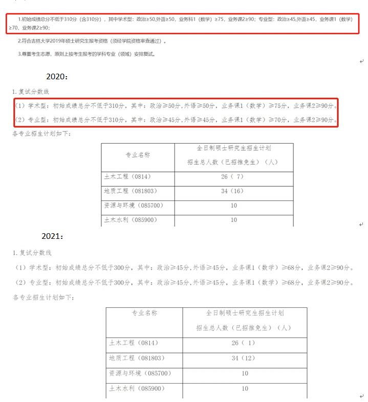 吉林大学土木工程专业学硕和专硕分数线每年都是相同的,2019和2020年总分数线是310分,2021年是300分。