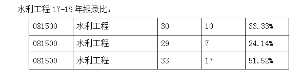 从以上可以看到,水利工程专业报录比有很大的波动变化,主要是因为每年学院会依据需求及时调节录取人数,但是整体录取人数有在增加,报名的人中肯定有一部分没有过线,因此报录比其实实际意义不是很大,更多的关注复试人数,和录取人数之间的比值,但就本人了解来看,录取人数占据了复试人数的大多数,甚至近几年仅仅淘汰一到二人,因此要好些准备初试,初试占据了很大的部分。分数线基本稳定在330分左右,英语录取线为55/55,算是比较高的分数。