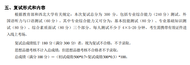 如果你来到复试,基本上已经大半只脚踏进西北大了,西北大学一般情况只会淘汰初试最差的少数几名同学,当然复试也是有机会翻盘的。具体和初试加权年年不同,官网可查。大概复试30%。分值成分如图所示,注意基本技能测试指的是实验仪器实操,如果是疫情线上的话就是给你一个实验题目让你口头表述,本专业是数电+模电实验。专业基础知识测试是四门专业课(微机原理、数字信号处理、信号与系统、通信原理)四选一,选的最多的是信号与系统、其他的都选的很少。我建议选数字信号处理,网上有现成的课程能帮助你快速把握书本的思想,在考试时一般是三道题,每道题都比较宽泛比如信号与系统问从复频域转化到时域的意义是什么?举几个变换公式并谈谈你的理解。需要你对整体课本有较好的把握程度。