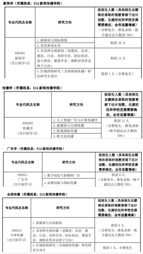就拿上海外国语大学新闻传播学硕来说。有新闻学、传播学和广告学三个专业,2019年新增了全球传播(学硕)和新闻与传播(专硕)。因此全球传播和新闻与传播2022年是第四年招生,目前报考人数都不是特别多。