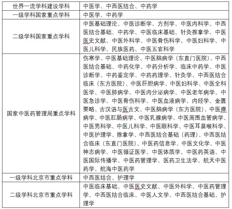 截至2018年10月,北京中医药大学是全国高等中医药院校中首批建立博士学科点和博士后科研流动站的单位之一,设有3个博士后科研流动站,3个一级学科博士学位授权,7个一级学科硕士学位授权,囊括42个二级学科博士学位授予点,有47个硕士学位授予点,5个专业学位类别,下设14个领域,包括9个博士学位授权点,14个硕士学位授权点;有一级学科国家重点学科2个,涵盖二级学科国家重点学科15个,国家中医药管理局重点学科48个,一级学科北京市重点学科2个,二级学科北京市重点学科8个。