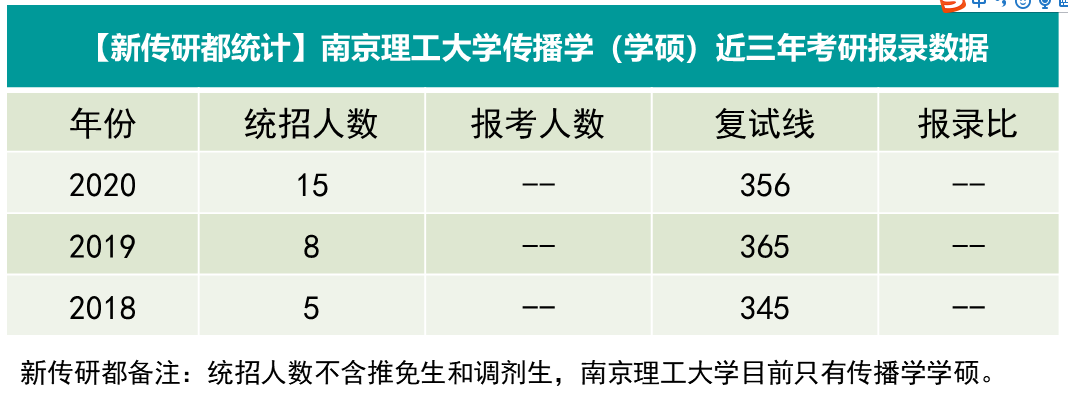 南理工只有传播学(学硕),没有新闻与传播(专硕),每年统招人数在10人左右,2020年涨到了15人与此同时,分数线也上涨了0分。
