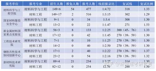 下面我说一下北京科技大学材料专业考研的一个情况,北科有6个单位招收材料专业的学生,在2019年之前,这6个单位是分开招生的,因为这6个单位的师资力量、热度等方面的原因导致他们的招生分数具有较大的差异,以2019年北科各单位招生情况所示(表1)。从2020年开始北科开始统一以材料学部的名义统一招生,统一划取招生线,这样的好处在于对于考生比较公平。从20年到现在北科材料学部一直是统一招生,具体复试线如表2所示。从近几年的一个考情来看,北科材料的报录比基本稳定在1:5左右,总体来说这个报录比不算太高,如果分数的话,基本学硕考340是比较稳的,专硕310以上,当然这只是给各位小伙伴提供一个参考,具体的还要根据每年的招生情况而定。