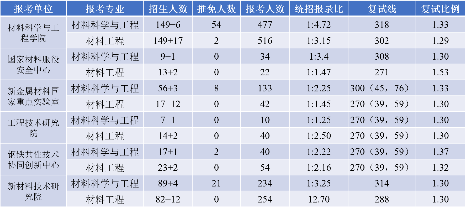 下面我说一下北京科技大学材料专业考研的一个情况,北科有6个单位招收材料专业的学生,在2019年之前,这6个单位是分开招生的,因为这6个单位的师资力量、热度等方面的原因导致他们的招生分数具有较大的差异,以2019年北科各单位招生情况所示(表1)。从2020年开始北科开始统一以材料学部的名义统一招生,统一划取招生线,这样的好处在于对于考生比较公平。从20年到现在北科材料学部一直是统一招生,具体复试线如表2所示。从近几年的一个考情来看,北科材料的报录比基本稳定在1:5左右,总体来说这个报录比不算太高,如果分数的话,基本学硕考340是比较稳的,专硕310以上,当然这只是给各位小伙伴提供一个参考,具体的还要根据每年的招生情况而定。