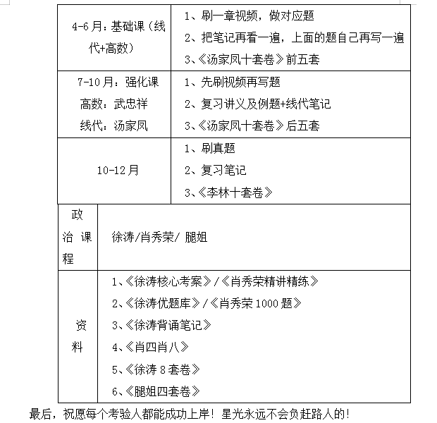 我们安排复习时间时,可根据初始考试时间来制定相应的复习规划。每年的考试日期会有微小波动,但是考试时间都是不变的,都是上午考政治和数学,下午考英语和专业课,所以我们可就把政治和数学复习时间安排在上午,英语和专业课复习时间安排在下午,以让我们形成上午的数学思维,下午的英语思维。每日作息表为:6点起床,6:30到8:00用来读书,前期单词是每天都必记的,我们可以给自己制定一个计划,比如每天记一到两百个单词,但是早上的一个半小时肯定是不够的,所以我们就把这些单词分为三个板块,早中晚三个板块分别记忆,这样既能利用零碎的时间,又能提高效率。