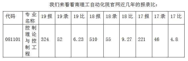 我们只看控制理论与控制工程的报录比,可以看出2017年的报录比低,紧接着2018报录比高,2019年报录比就相对2018下降少许,但是仍旧高于2017。总而言之报录比总体上还是在上升,但并没有过于可怕。事实上南理工这些年一直在扩招,考上的概率也是在增加的。而且据我自己的经验,报的人是多,但是初试时考场里很多人根本不来参加考试,到复试时考场里还是有很多人弃考。所以不要被报录比吓到,只要你坚持到最后,你考上的概率就比别人大一截。