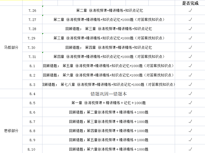 (2)复习规划。我是从7月底开始准备复习的,正式开始复习是在开学之后了。政治的强化班是我在复习初期就开始在听了。我建议前期不用耗费大量时间在政治上,跟着徐涛老师的课和肖秀荣老师的精讲精练、1000题,听课做题打基础。一定要做好学习时间规划,每天的任务量是多少,要清晰明确。例如我截图了我的部分政治学习计划,根据每章节的难度、内容多少进行任务量划分。政治部分我的备考思路建议如下(根据个人复习时间调整):